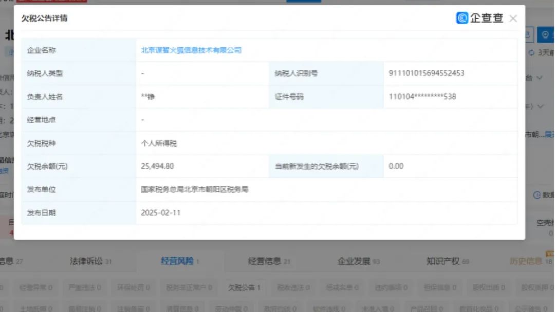 企查查显示,2025年2月11日,国家税务总局北京市朝阳区税务局发布了一则关于北京谋智火狐信息技术有限公司的欠税公告,所涉欠税税种为个人所得税,欠税金额为25494.8元,其公司法人过某2023年曾被冻结股权。