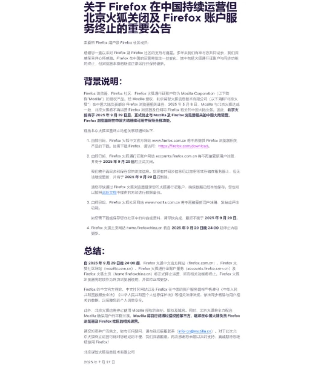 7月27日,北京谋智火狐信息技术有限公司发布了“关于Firefox在中国持续运营,但北京火狐关闭及Firefox账户服务终止的重要公告”。