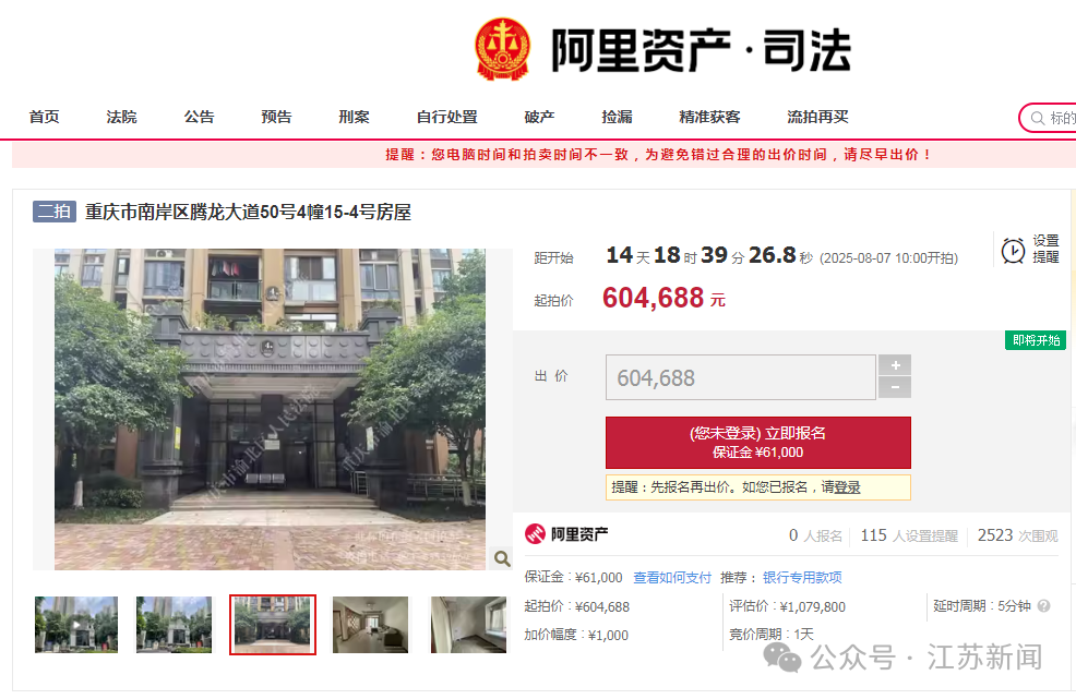 阿里法拍平台显示,目前报名人数为0,有115人设置了提醒,2523次围观。