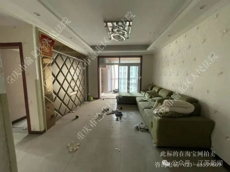 据阿里法拍平台公示内容,该房屋位于重庆市南岸区腾龙大道50号4幢15-4号,面积82.43平方米,欠物业费4170元。评估价:107.98万元,起拍价:60.4688万元。