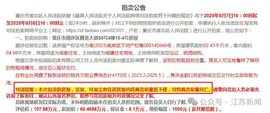 公告特别提醒:本次拍卖的房屋,张某、叶某尘曾在该房屋内将两名幼童推下楼,导致两名幼童死亡。请意向竞拍人务必事先咨询了解看样,确认后再报名参拍。如参与竞拍即视为对该情况完全了解。