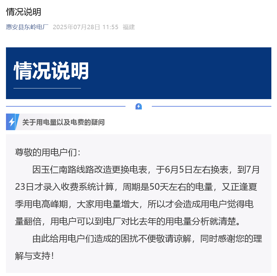7月28日,针对关于用电量以及电费的疑问,福建泉州市惠安县东岭电厂发布情况说明。