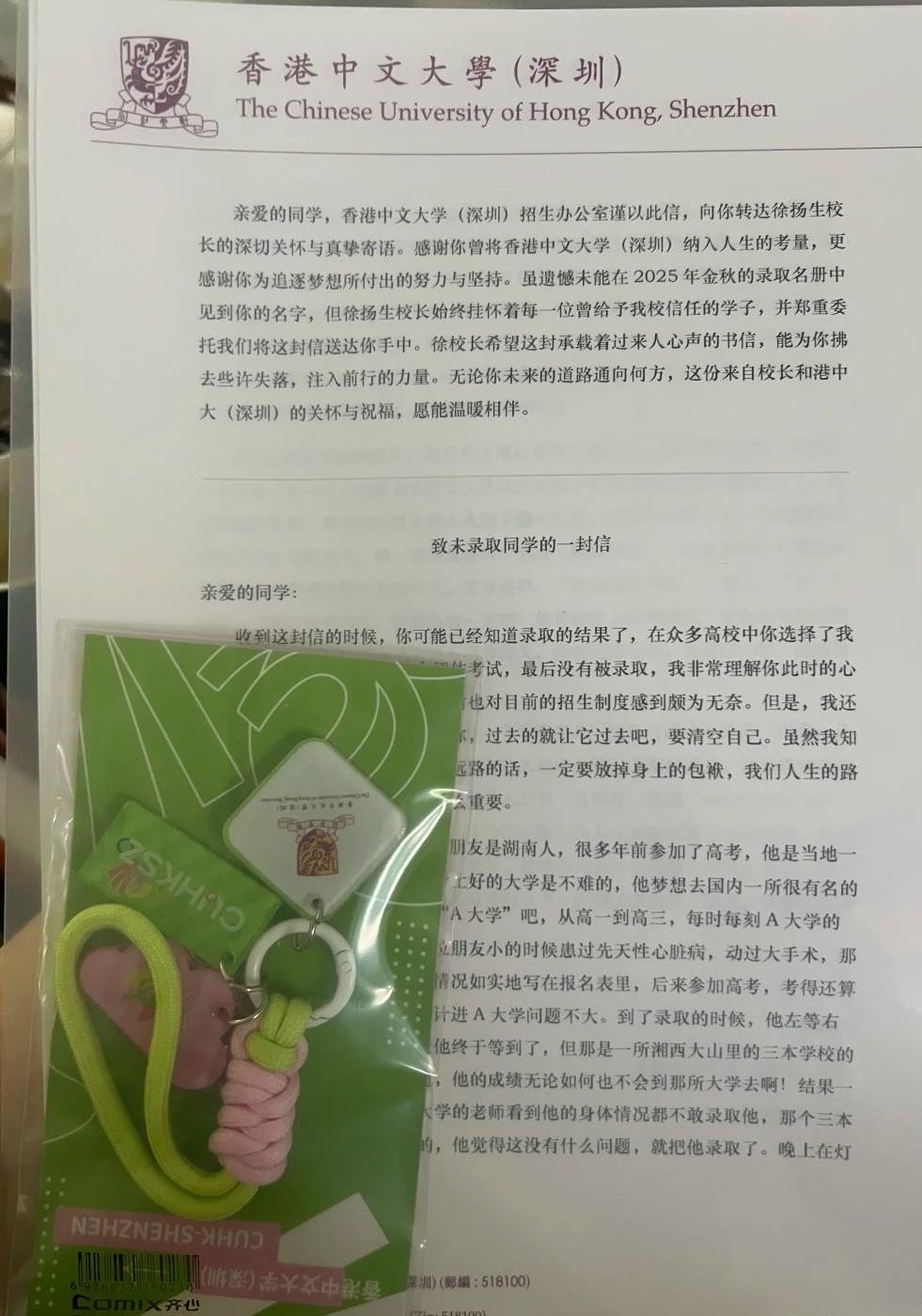 该网友所配图片显示,其收到了香港中文大学(深圳)校长徐扬生的一封信,其中写道:“在众多高校中你选择了我们,并参加了我们组织的综合评估考试,最后没有被录取,我非常理解你此时的心情。确实,我也感到很遗憾……但是,我还是想写一封信给你,只是想告诉你,过去的就让它过去吧,要清空自己……人生的路很长,高考并非你现在所想的那么重要。”校方还随信寄来了一些小挂件作为礼物。