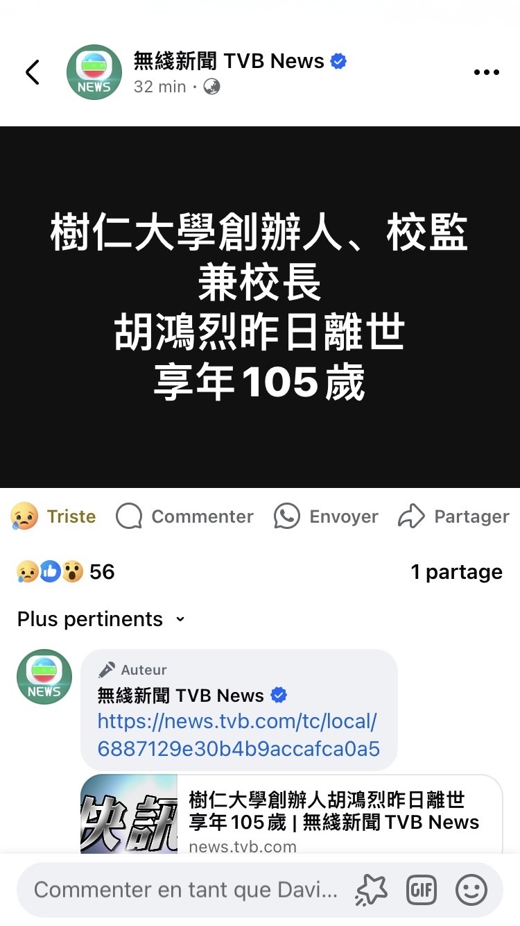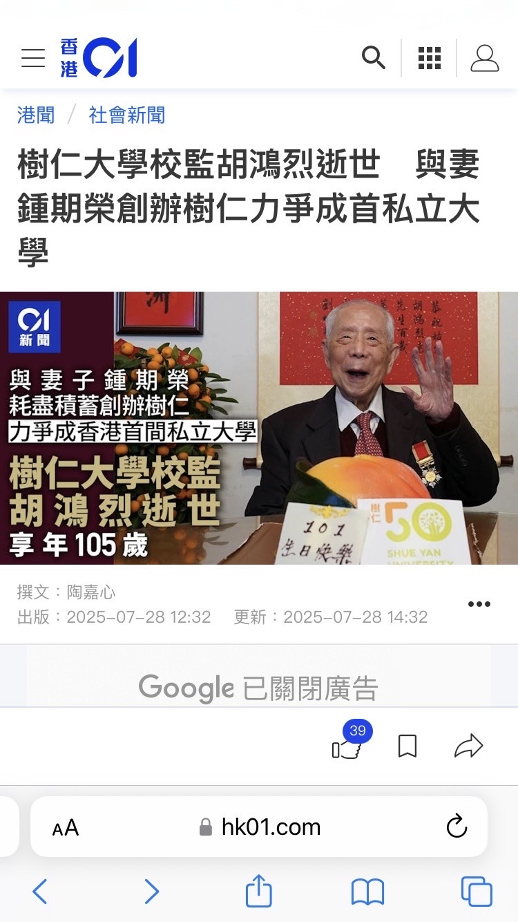 据香港媒体报道,香港树仁大学校监、中国中央电视台《感动中国》2007年度获奖人物胡鸿烈于7月27日在家人陪伴下安详离世,享年105岁。胡博士还是法国巴黎大学的校友。