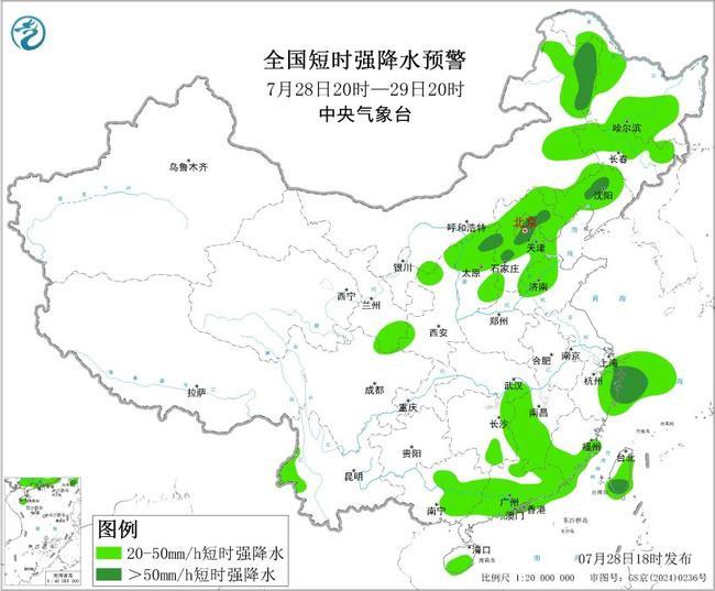 中央气象台7月28日18时发布强对流天气黄色预警:预计7月28日20时至29日20时,内蒙古东部、东北地区中西部、华北中东部、江南东部等地的部分地区将有8级以上雷暴大风或冰雹天气,其中,河北中南部将有10级以上雷暴大风;内蒙古东部、东北地区中西部、华北中东部、江南、华南等地的部分地区将有小时雨量大于20毫米的短时强降水天气,其中,内蒙古东北部、辽宁中北部、山西北部、河北中部、北京东南部、浙江东部等地的部分地区小时雨量大于50毫米,最大可达80毫米以上。