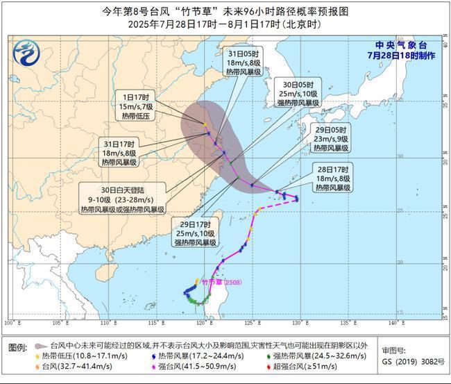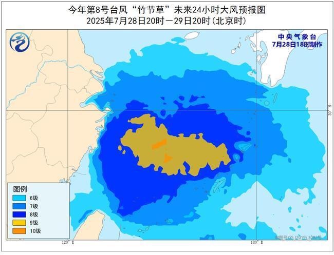 中央气象台7月28日18时继续发布台风蓝色预警:今年第8号台风“竹节草”(热带风暴级)的中心今天(28日)下午5点钟位于浙江省舟山市东偏南方向约620公里的东海南部海面,就是北纬26.9度、东经127.5度,中心附近最大风力有8级(18米/秒),中心最低气压为992百帕,七级风圈半径200—300公里。