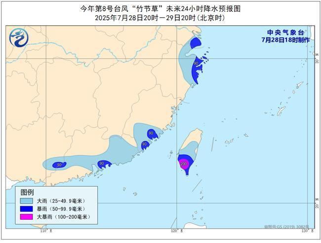降水预报:7月28日20时至29日20时,上海、浙江东部、福建东南部、广东东部和南部、台湾岛等地部分地区有大到暴雨,其中,台湾岛南部部分地区有大暴雨(100—200毫米)。上述部分地区伴有短时强降水(最大小时降雨量20—60毫米,局地可超过80毫米)。