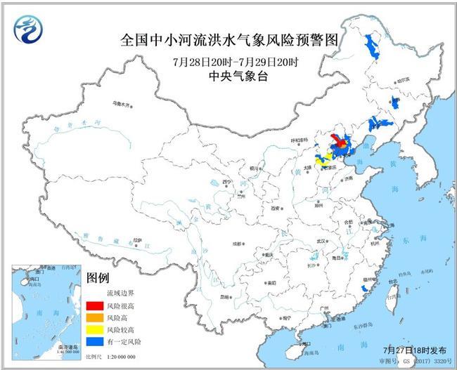 中央气象台7月28日18时发布中小河流洪水气象风险预警:预计,7月28日20时至29日20时,北京东部、天津北部、河北东北部等地部分地区发生中小河流洪水的气象风险高(橙色预警),其中,北京东部、天津北部、河北东北部部分地区发生中小河流洪水的气象风险很高(红色预警)。