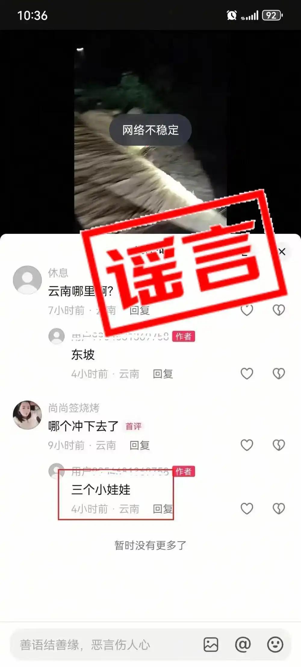 近日,云南楚雄网警工作发现,一网民在网络平台发布武定县公安局民警全力救援被山洪围困群众的视频。有网民在评论区询问事发地点和谁被冲走时,发布者回复“东坡”“三个小娃娃”。