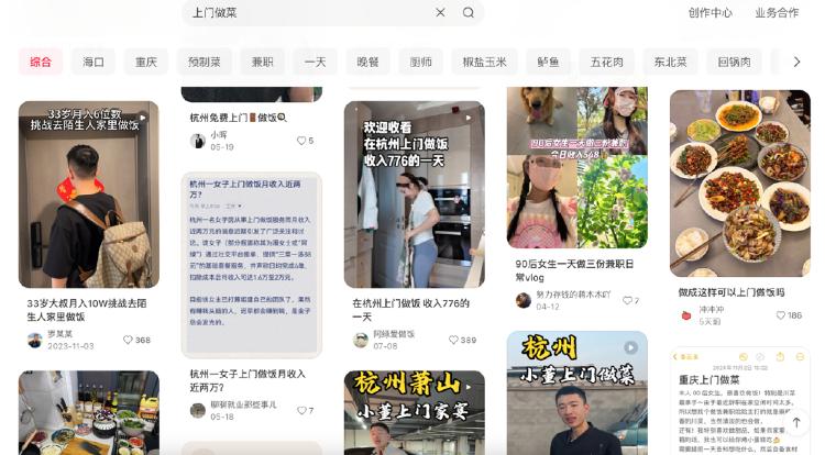 在社交媒体平台搜索“上门做菜”得到的部分帖子。截图自网络