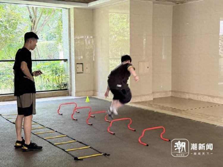 虽然年纪不大,个头也不高,小壮的体重却达到了130斤。一个小时里,在邵路安的一对一指导下,小壮进行了跳绳、抗阻力跳跃、折返跑等十几个项目的练习,累得满头大汗、气喘吁吁。