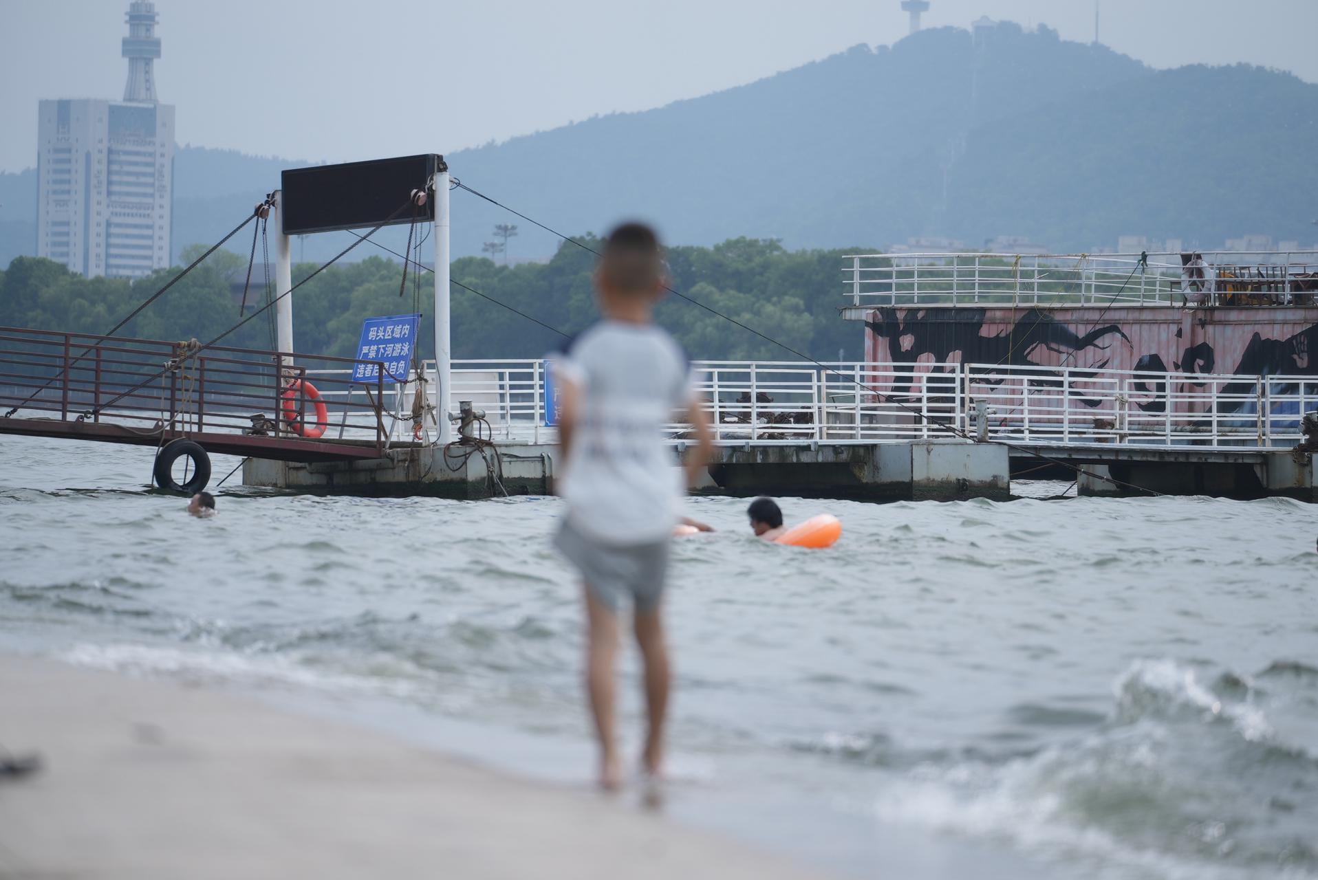 记者还注意到,江边附近风浪很大,相当考验下水游泳者的体力。