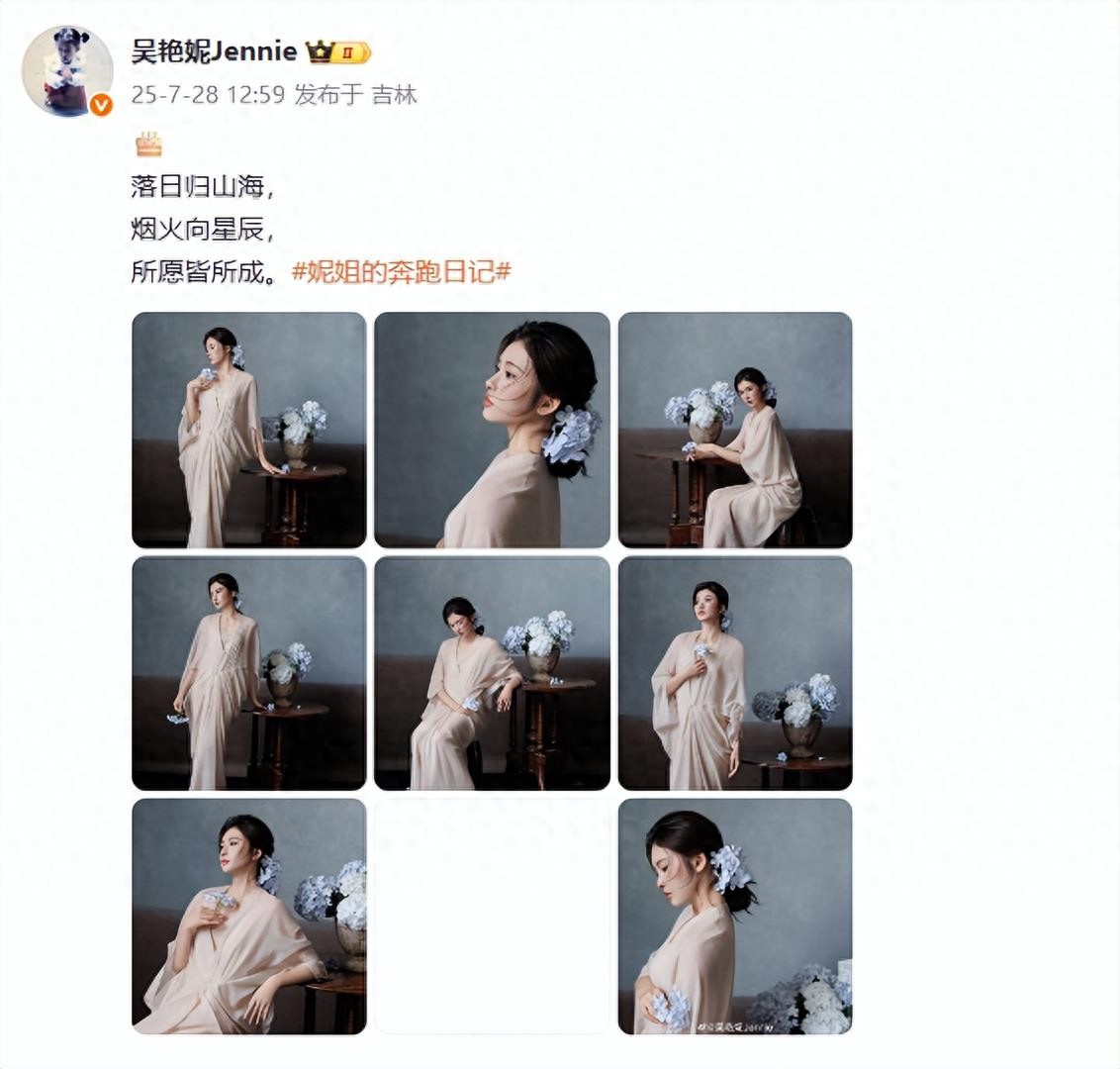 7月28日,吴艳妮在社交平台晒照庆祝28岁生日。吴艳妮还称:“愿望就是我的发送时间。”