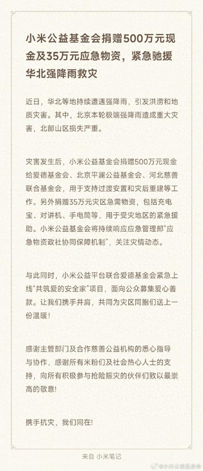 7月29日,雷军发文宣布:@小米公益基金会 捐赠500万元现金及35万元应急物资,紧急驰援华北强降雨救灾。携手救灾,我们同在!