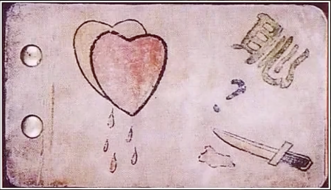 在相册封面,罗瑾画了一幅图:左边是两颗鲜红的心脏,右下方一把利刃刺向心脏,滴出了鲜血。