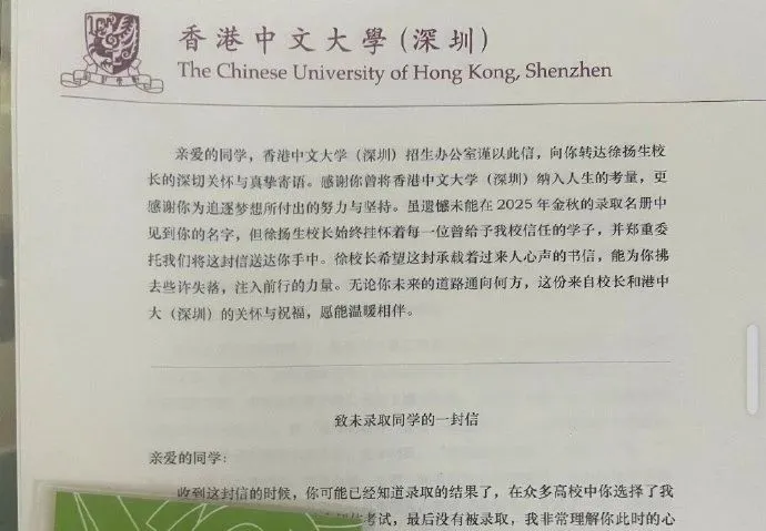 近日,一名高三毕业生未能考上香港中文大学(深圳),但却意外收到了新学校寄来的“未录取通知书”,相关话题登上热搜。(此前报道:冲上热搜!广东一大学发“未录取通知书”)