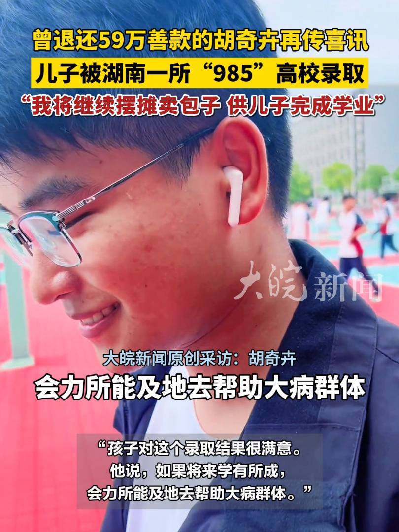 “孩子对这个录取结果很满意。他说,如果将来学有所成,会力所能及地去帮助大病群体。他还说,‘安得广厦千万间,大庇天下寒士俱欢颜’。”胡奇卉告诉记者,儿子能从个人苦难想到群体关怀,作为妈妈她感到很骄傲。但是她自己内心觉得孩子上学的地方离家有点远,“接下来,我将继续摆摊卖包子,供儿子完成学业。”