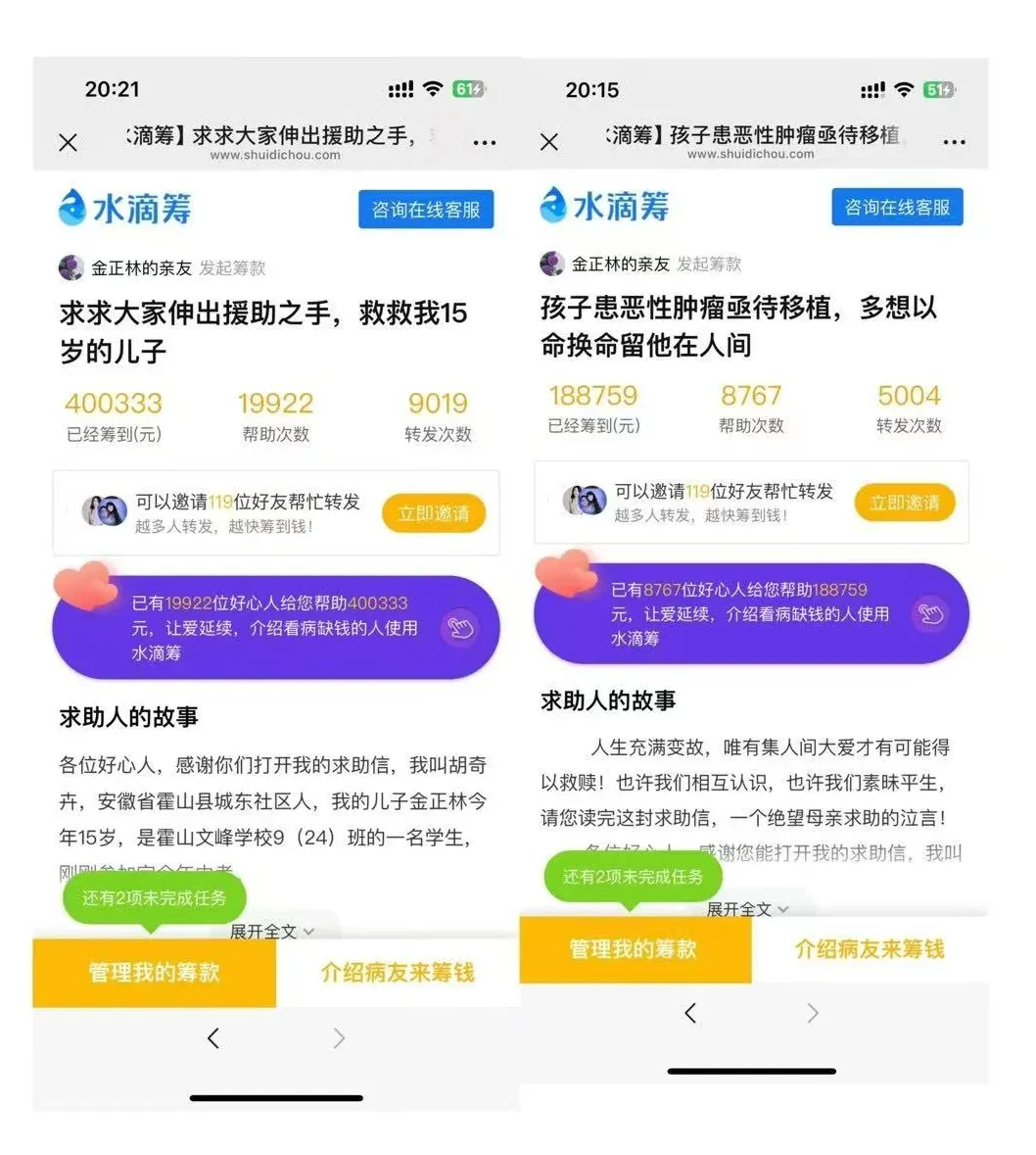 2019年,安徽霍山14岁少年金正林中考取得760分高分,但拿到成绩单后不久他就被确诊急性白血病,面对百万治疗费用,其走投无路的妈妈胡奇卉在水滴筹平台先后两次发起筹款,短时间内共筹得善款近59万元。