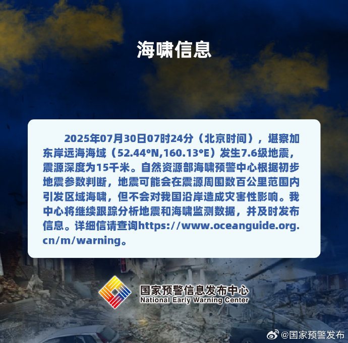 国家海洋预报台:堪察加附近发生7.6级地震或引发海啸,但不会对我国沿岸造成灾害性影响