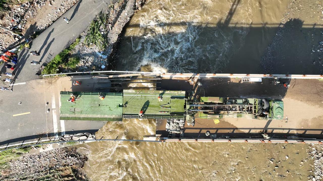 当救援队伍抵近营子村时,一座被拦腰折断的桥梁横亘在官兵面前。受洪水影响,这座王北沟门桥的桥面被冲毁,残余的桥墩摇摇欲坠,湍急的河流肆意奔腾,任务分队指挥员眉头紧锁、语气坚定:“桥梁分队,架桥!”