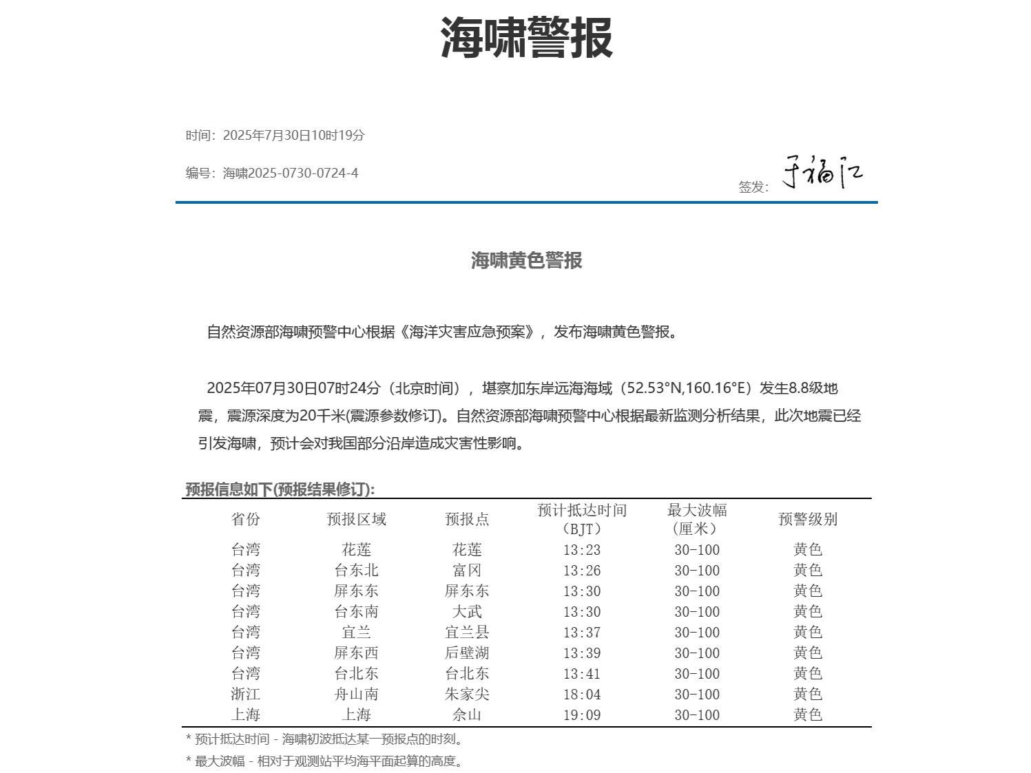7月30日,极目新闻记者了解到,7月30日10时19分,自然资源部海啸预警中心根据《海洋灾害应急预案》发布海啸黄色警报:2025年07月30日07时24分(北京时间),堪察加东岸远海海域(52.53°N,160.16°E)发生8.8级地震,震源深度为20千米(震源参数修订)。自然资源部海啸预警中心根据最新监测分析结果,此次地震已经引发海啸,预计会对我国部分沿岸造成灾害性影响。