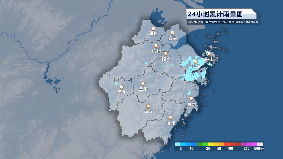 29日08时至30日08时,有23个县(市、区)面雨量超过50毫米,其中13个超过100毫米,200毫米以上的有鄞州区203毫米、镇海区202毫米,有227个乡镇(街道)超过100毫米,其中57个超过200毫米,最大为鄞州横溪镇297毫米。风力较大的有北仑区后焦山36.9米/秒(12级)、岱山县七姐八妹36.1米/秒(12级)、嵊泗县浪岗35米/秒(12级)。