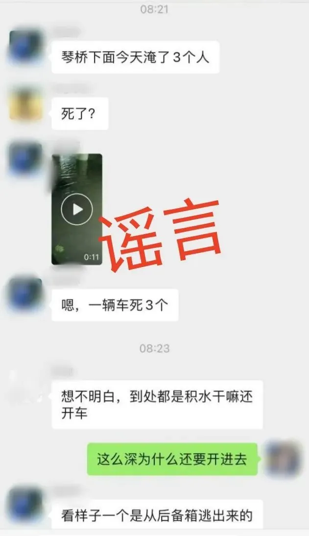 7月30日8时许,微信网民陆某某(女,48岁,宁波鄞州人)在多个微信群中谣称“琴桥下淹了3个人”“嘎了”“一辆车死三个”等信息。目前该信息已在多个微信群进行传播,造成一定影响。目前公安机关已对陆某某依法予以批评教育。