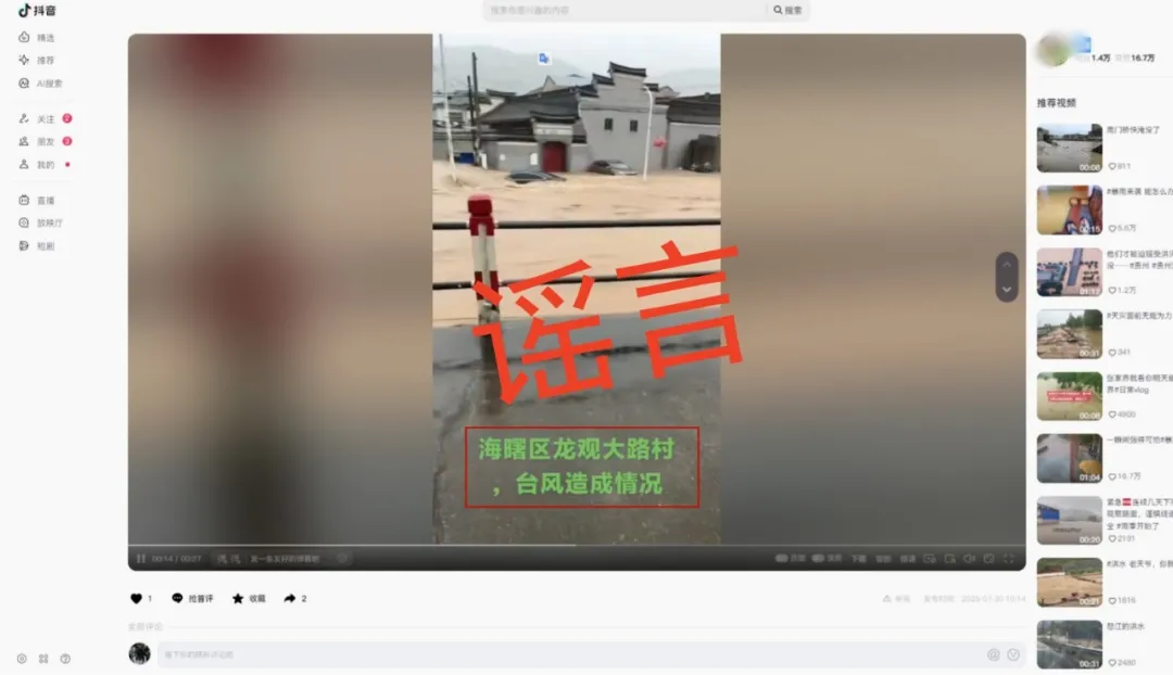 网络谣言如同无形暗流,破坏力不容小觑。防汛抗灾是一场争分夺秒的硬仗,宝贵的社会注意力与救援资源如果被谣言牵制,不仅容易引发公众焦虑恐慌,更可能干扰指挥决策与救援部署,影响防汛抗灾工作正常开展。