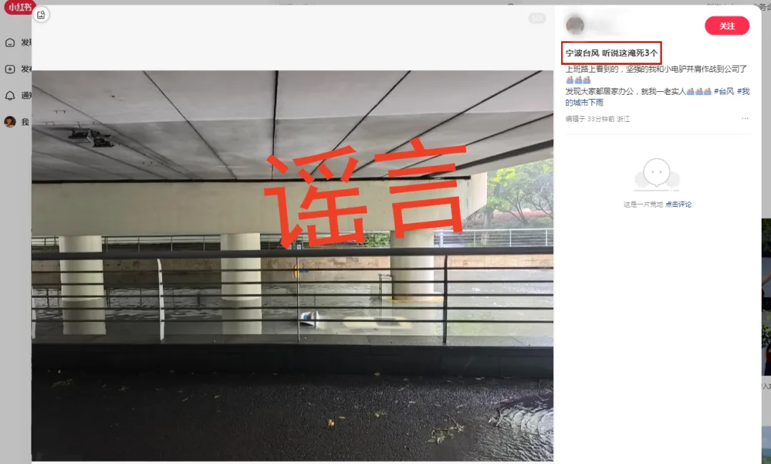 7月30日9时许,小红书网民沈某(女,23岁,宁波鄞州人)发贴谣称宁波一涵洞内车辆被淹,有3人淹死。经核查,该内容系谣言,目前公安机关已对沈某依法予以批评教育,该贴文现已删除。