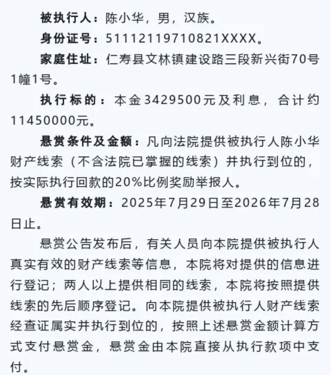 悬赏公告显示,被执行人叫陈小华,男,汉族,家庭住址在仁寿县文林镇建设路三段新兴街70号1幢1号。执行标的为本金3429500元及利息,合计约11450000元。同时,公告还公布了悬赏条件及金额,凡向法院提供被执行人陈小华财产线索(不含法院已掌握的线索)并执行到位的,按实际执行回款的20%比例奖励举报人。悬赏有效期是从2025年7月29日至2026年7月28日止。