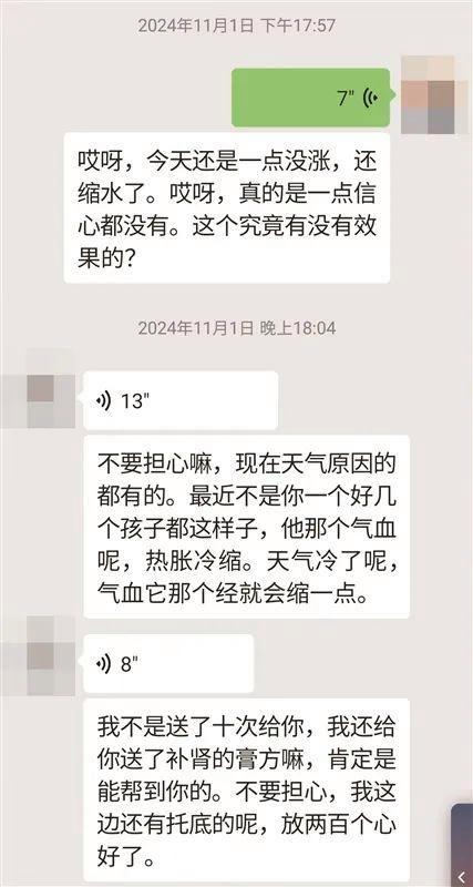 到今年1月下旬,郑女士手头的生长贴用完,她又跟该李姓负责人沟通,是否要开始新疗程。李姓负责人回复,春节后开启新疗程,孩子的气血调理起来了,自然会再长高。