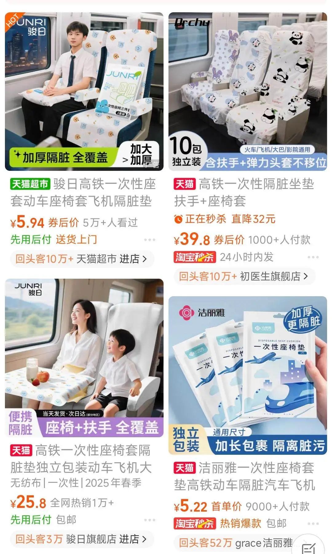 近日,“高铁座椅套更换频率不高,可能传染皮肤病”等话题引发热议,与之相应,一次性座椅套在网络热销。