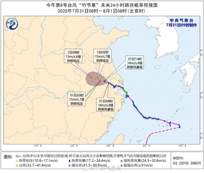 今年第8号台风“竹节草”(热带风暴级)的中心09时位于江苏省宜兴市,也就是北纬31.5度、东经119.7度,中心附近最大风力有8级(18米/秒),中心最低气压为988百帕。预计“竹节草”将以每小时10公里左右的速度向西偏北方向移动,强度缓慢减弱。