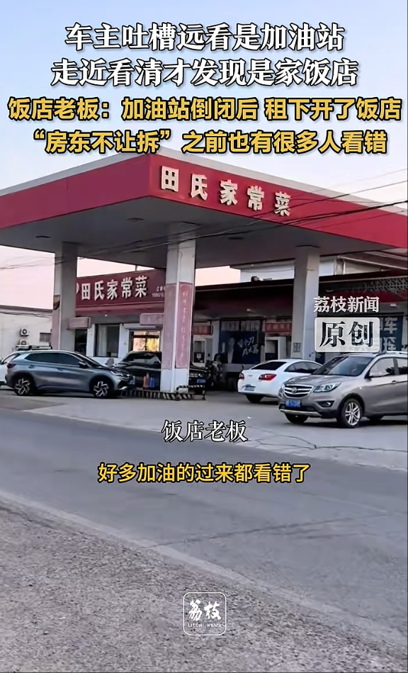 饭店老板回应荔枝新闻记者,好多加油的过来都看错了,加油站不干了,我盖了个饭店,房东不让拆,他还等着拆迁。