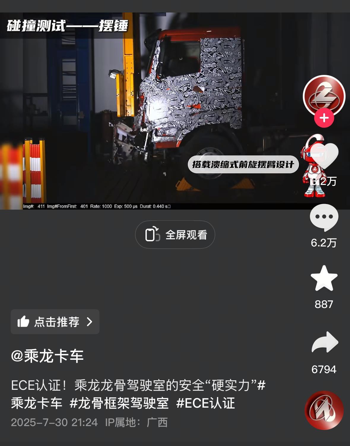 乘龙卡车是东风柳州汽车有限公司旗下的商用车品牌。两天过去后,关于理想i8与乘龙卡车碰撞测试的讨论仍在发酵。7月30日晚,乘龙卡车发布了一则视频疑似回应此事,视频中展示了多个测试项目,并称乘龙龙骨框架驾驶室,达到世界级安全品质标准。