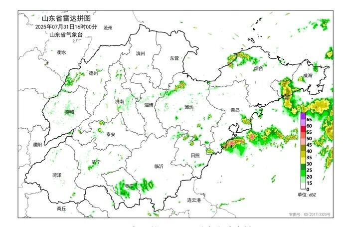 31日16时,山东省气象台台风蓝色预警、暴雨蓝色预警、海上大风黄色预警生效中;青岛、烟台、日照、临沂台风蓝色预警生效中,烟台暴雨黄色预警、威海暴雨蓝色预警生效中,菏泽高温黄色预警生效中。