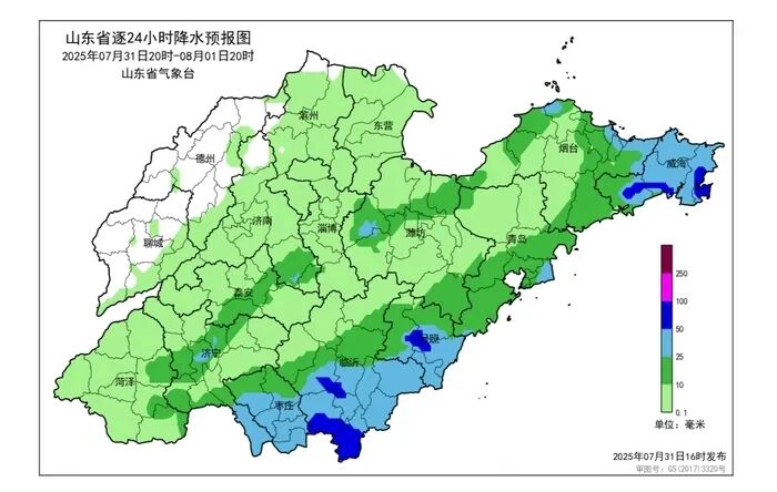 7月31日夜间到8月1日白天,枣庄、临沂、日照、潍坊和半岛地区天气阴有中到大雨局部暴雨或大暴雨并伴有雷电,淄博、济南、泰安和济宁天气多云转阴有小到中雨局部大雨或暴雨并伴有雷电,其他地区天气多云间阴局部有雷雨或阵雨。临沂、日照和半岛地区偏东风4~5级阵风6~7级,其他地区北风3~4级,雷雨地区雷雨时阵风7~9级。最低气温:鲁中山区23℃左右,其他地区25℃左右。最高气温:菏泽、德州和聊城34℃左右,枣庄、临沂、日照、鲁中山区和半岛地区30℃左右,其他地区32℃左右。
