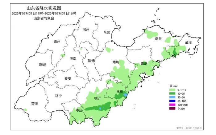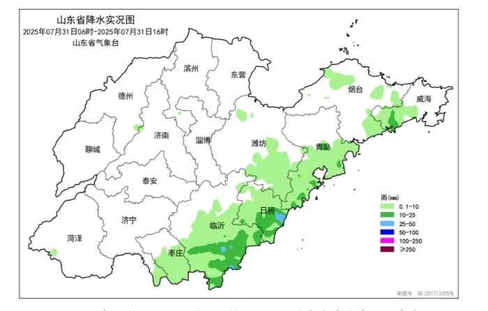 据山东省气象台消息,7月31日11时至31日16时,全省共有7市、31县(区市)、396乡镇出现降水,平均降水量0.8(毫米,下同),折合水量约1.3亿立方米。各市平均:日照6.7、临沂3.8、威海1.7、青岛1.1和枣庄1.0。其他市降水量不足1.0或无降水。降水量前3位的是:临沂河东区临沂水文站44.0、日照东港区石臼所39.5和日照气象局39.0。