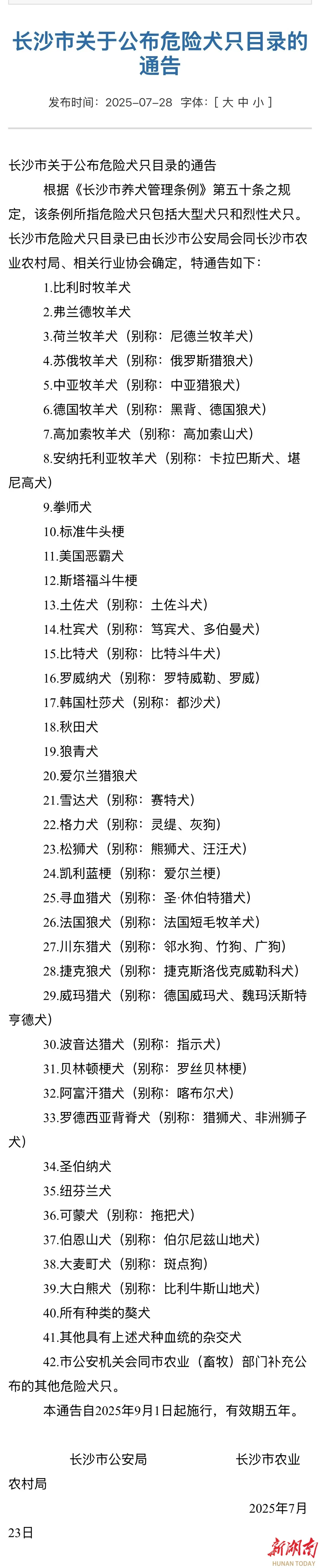 8月1日,记者注意到,《长沙市公安局》《长沙市农业农村局》于7月28日联合印发的《长沙市关于公布危险犬只目录的通告》中,中华田园犬(土狗)被移出《危险犬只目录》,该《通告》自2025年9月1日起施行,有效期五年。
