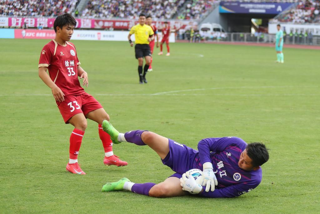 2025年6月15日,镇江队门将沈帅帅(下)在比赛中扑救。新华社发(白雪 摄)