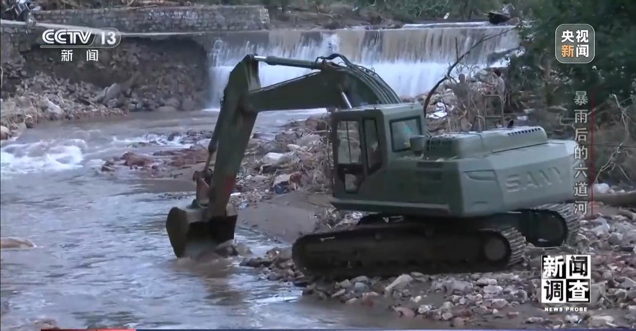 7月30日中午,武警的挖掘机进入河道,开始就地取材,利用河中的山石建设桥梁路基。