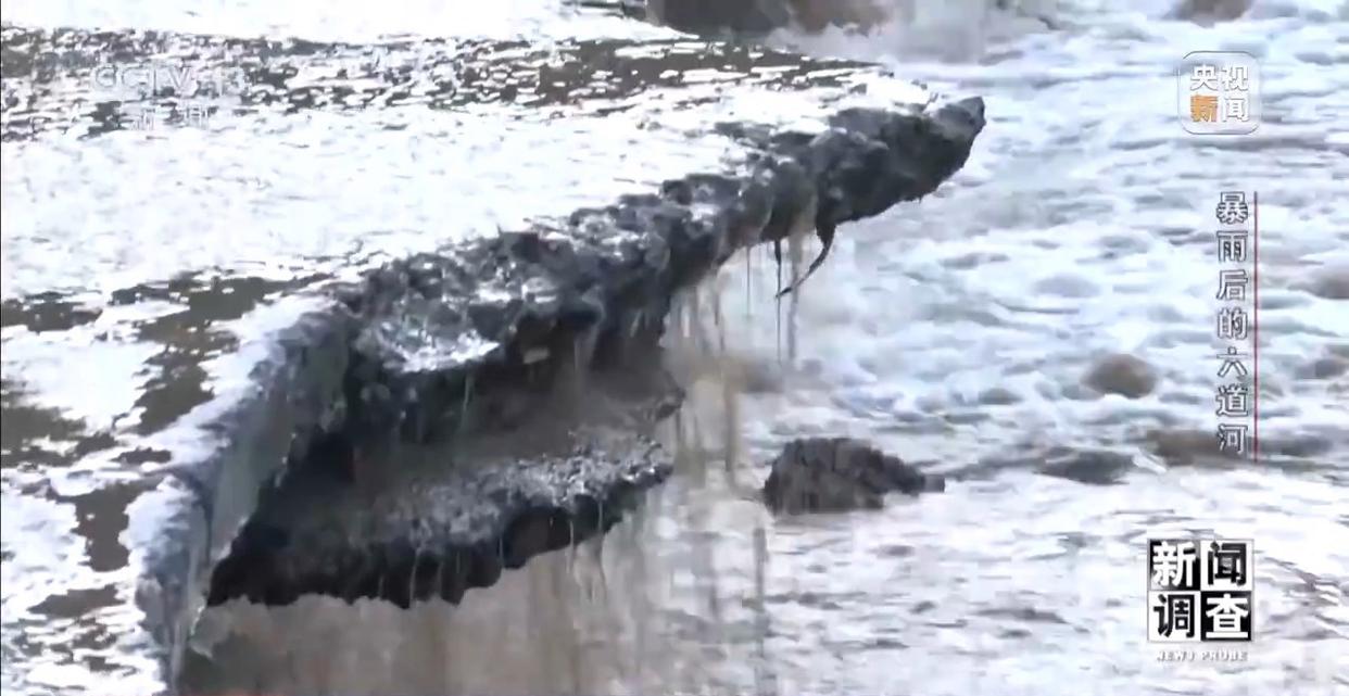 水流的改道也让原先的水泥桥重新显露了出来。但因为下方石基已经被基本冲毁掏空,道路只能供行人和摩托车通过,记者也得以通过这座水泥桥走到河对岸。