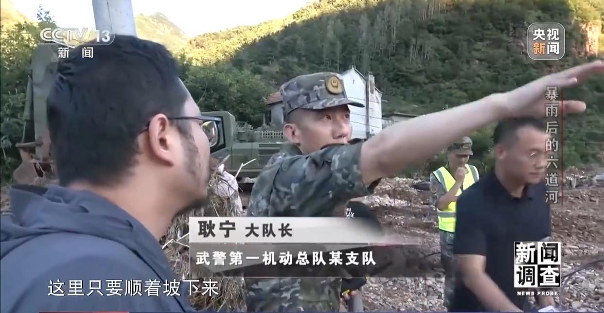 武警第一机动总队某支队大队长 耿宁:这边是抢工速度最快的一条路了,这里只要顺着坡下来,上面就有条路。然后我就选了一个最捷径的通道,先让物资能进去,开辟一条捷径出来。