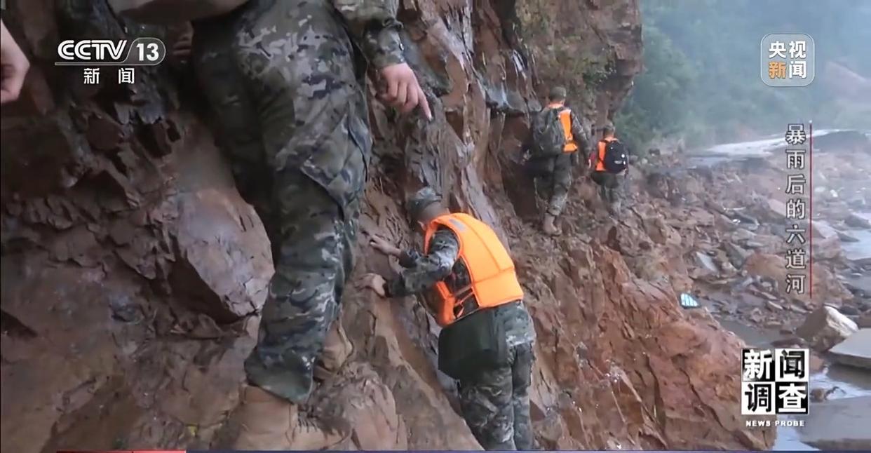 五道河村也受灾严重,沿崖壁而建的水泥村道被山洪完全冲毁,想要前进,必须在近乎90°的绝壁上攀爬,崖壁最窄处几乎难以下脚。