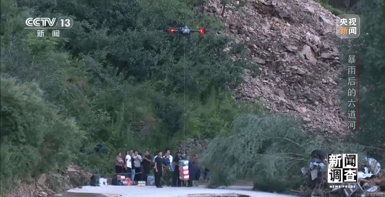 由于道路受损一时难以修通,全靠人力运送物资非常艰难,当地政府启用了载重无人机,向受灾村子运送物资。晚上8时左右,五道河村通往朱家沟村的断路旁的空地上,承德市公安局的一架无人机正在向五百米外的中转点运送方便面和矿泉水。