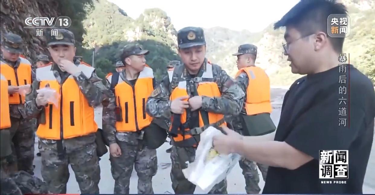 朱家沟村的8个小组分布范围广,布局分散,为了让给养物资能够快速发到群众手里,消防与武警官兵兵分两路,沿两条不同方向的山沟前进,由村里向导带领,到各组集中发放物资。