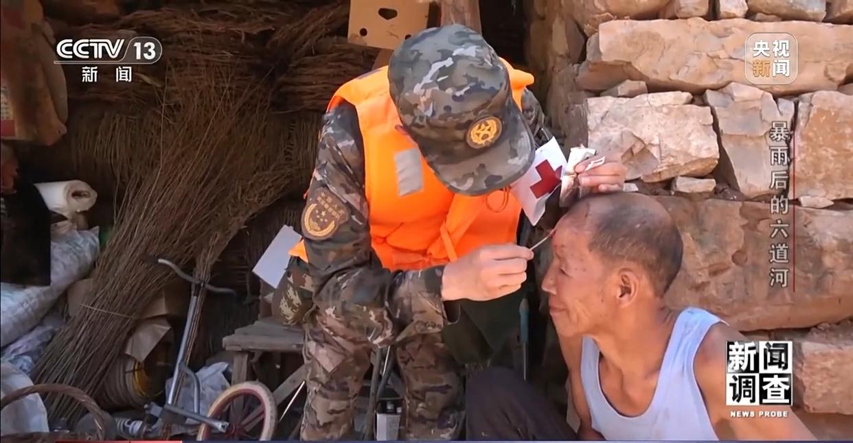 武警在朱家沟村三组还发现了一名在泥石流中严重受伤的村民。由于道路不通,无法将伤员安全转运到医院去检查治疗,军医只能对他做一些简单的伤口处理。