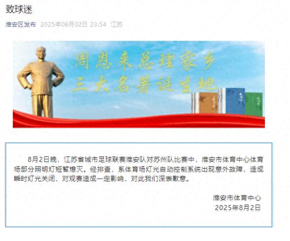 据淮安区发布消息,8月2日晚,江苏省城市足球联赛淮安队对苏州队比赛中,淮安市体育中心体育场部分照明灯短暂熄灭。经排查,系体育场灯光自动控制系统出现意外故障,造成瞬时灯光关闭,对观赛造成一定影响,对此深表歉意。