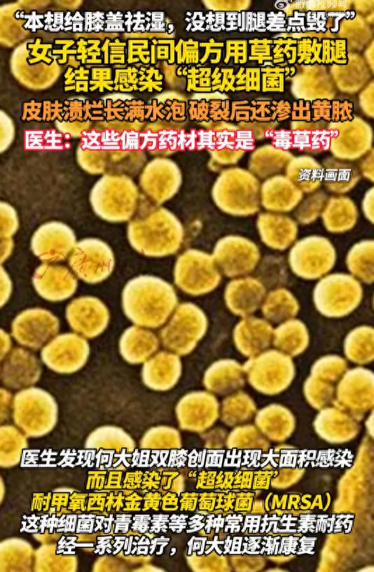 医生发现,何大姐双膝创面出现大面积感染,而且感染了“超级细菌”,耐甲氧西林金黄色葡萄球菌(MRSA),这种细菌对青霉素等多种常用抗生素耐药,经一系列治疗,何大姐逐渐康复。医生提醒,民间偏方药材如毛莨、苍耳子、曼陀罗等,其实是“毒草药”,自行使用风险极大,如有身体不适需及时就医。