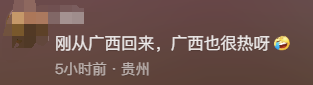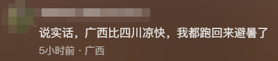 王先生将视频发布至网上后,有网友好奇,“确定回广西避暑?”“广西也很热”,也有网友表示认可,“说实话,广西比四川凉快,我都跑回来避暑了”,对此,王先生表示,“广西的气温是没有长沙那么热的,晚上会比较凉爽一点,长沙晚上的话都还是很闷热,所以说就有点受不了。可能长沙表面气温只比广西高几度,但是体感温度比南宁会高很多。”